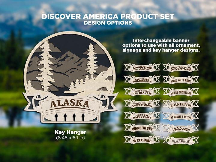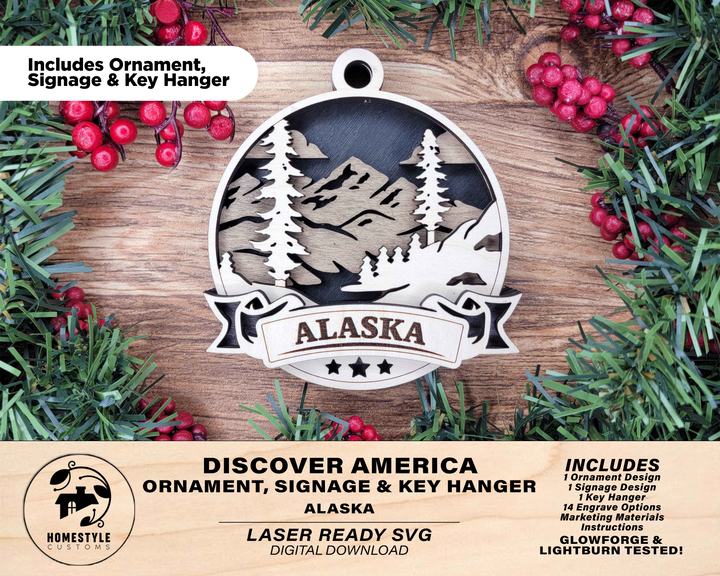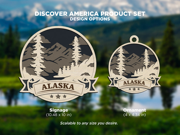 Alaska Discover America Set - Includes Ornaments, Signage & Key Hanger - SVG, PDF, AI File types - Works With All Lasers