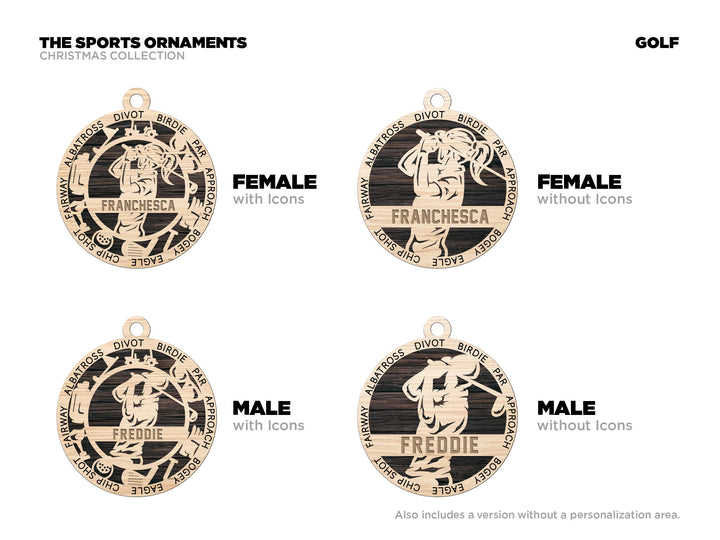 4 - Golf ornaments (Sized at 4") Includes 2 styles and a male and female variation. See product photos for everything included.