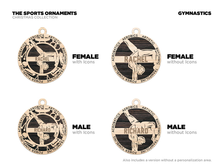 4 - Gymnastic ornaments (Sized at 4") Includes 2 styles and a male and female variation. See product photos for everything included.