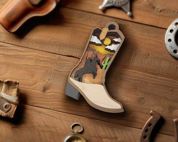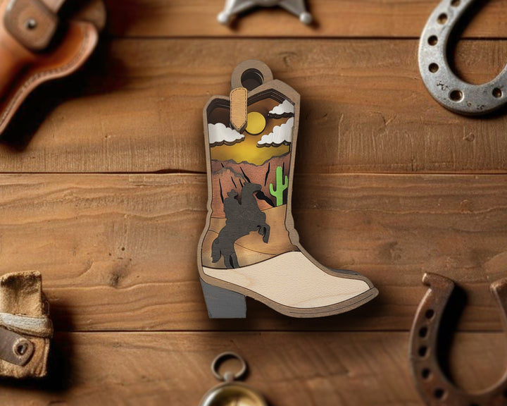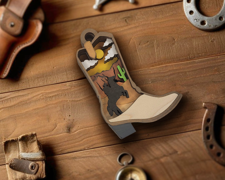 The Layered Cowboy Boot Ornament and Magnet Laser Designdesign brings western flair to life in a fun, layered style. Inside the boot shape is a desert scene with a running horse, hills, cacti, and an open sky above. It’s a standout piece with just the right amount of detail for anyone who loves cowboy charm or desert views. Use it as a fridge magnet, holiday ornament, or display piece that tips its hat to the spirit of the Wild West.