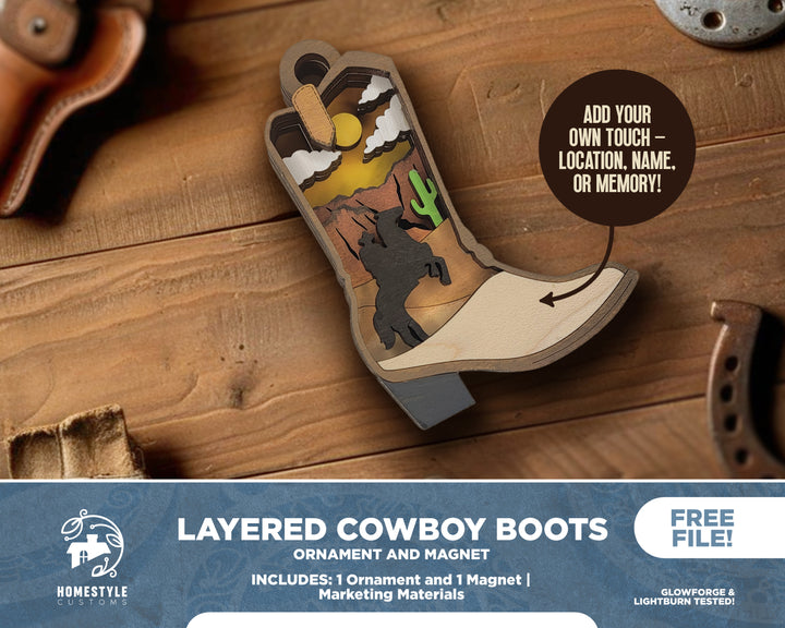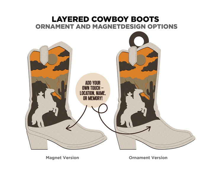 Layered Cowboy Boots - Ornament and Magnet - SVG, PDF, AI File Download - Works with all Laser Types
