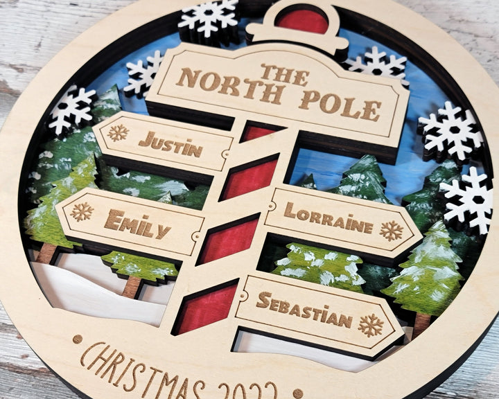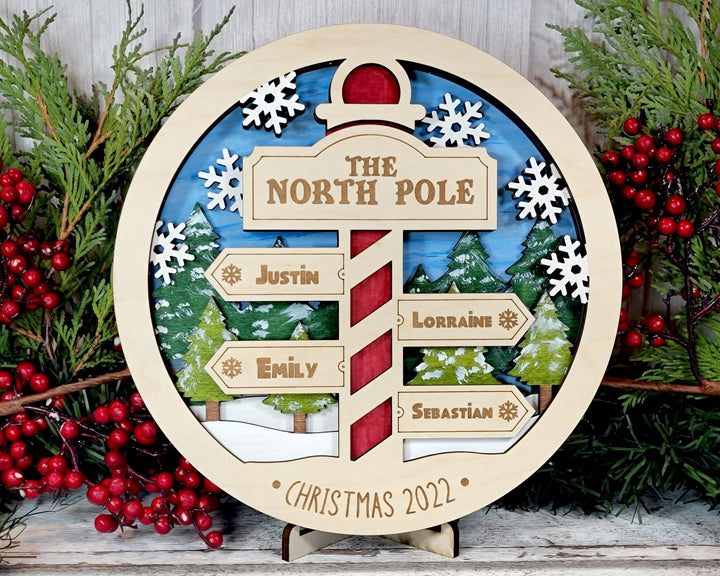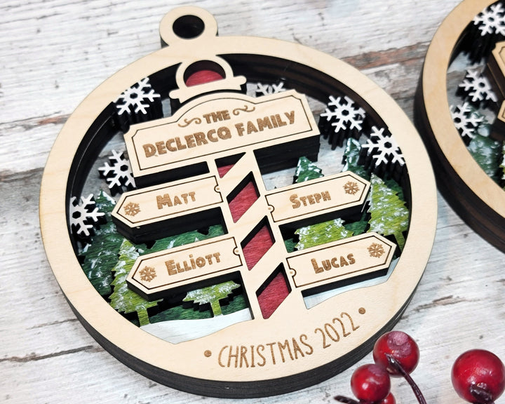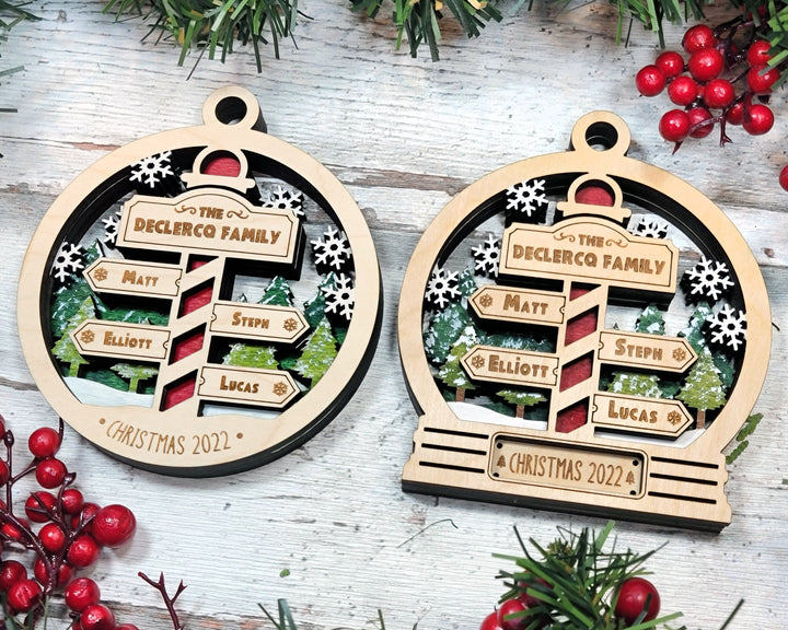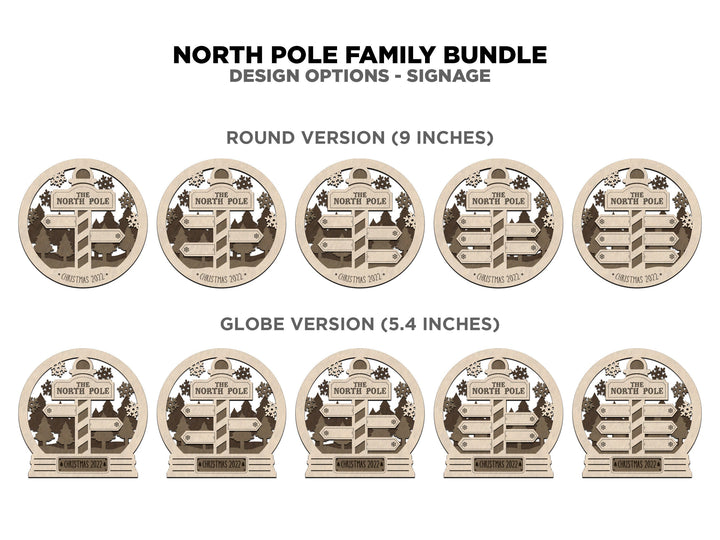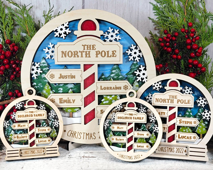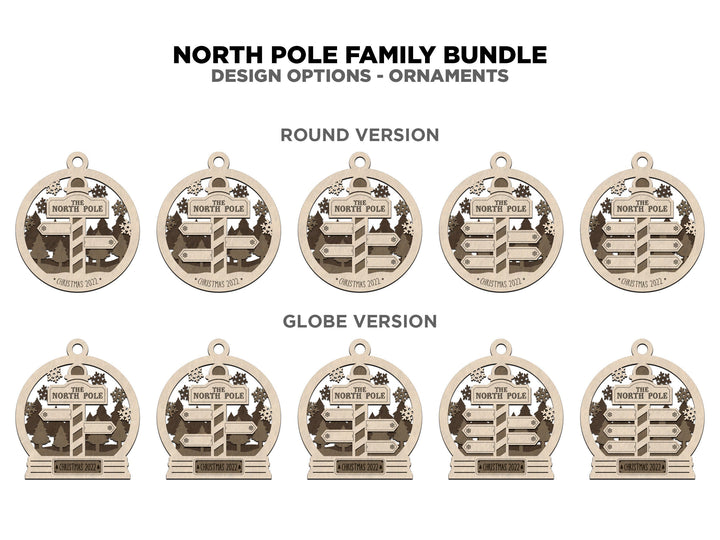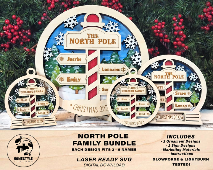 North Pole Family Bundle - 2 Ornaments & 2 Signs Included - Each Design Fits 2-6 Names - SVG, PDF, AI File Download - Sized for Glowforge