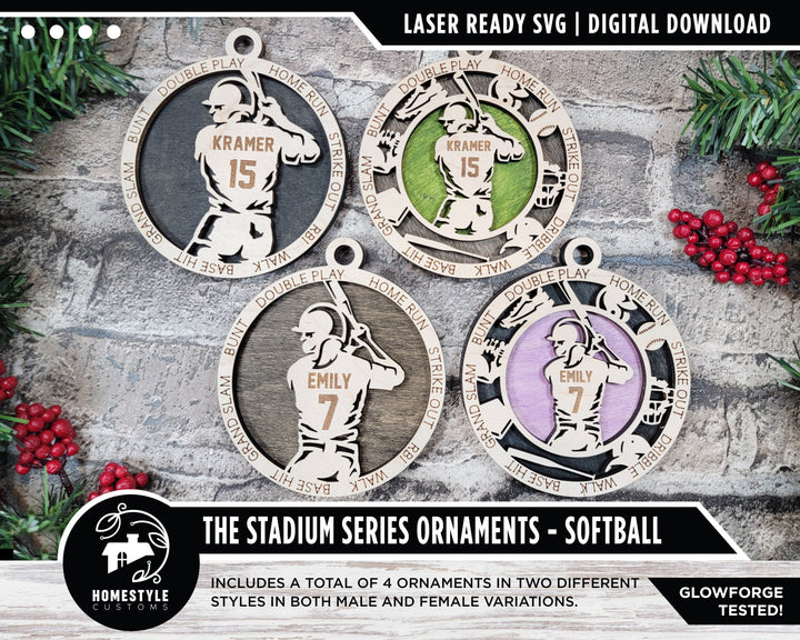 Softball - Stadium Series Ornaments - 4 Unique designs - SVG, PDF, AI File Download - Sized for Glowforge