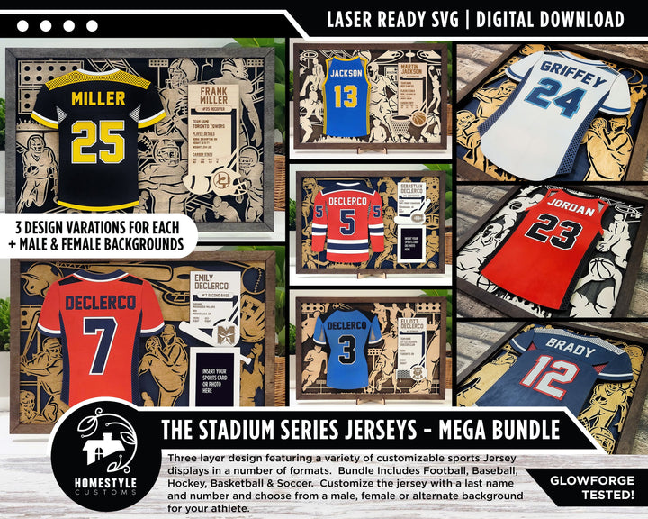 Stadium Series Jersey Mega Bundle - 5 Sports - 3 Variations for Each - Male, Female & Alternate Backgrounds - SVG Files -Sized for Glowforge