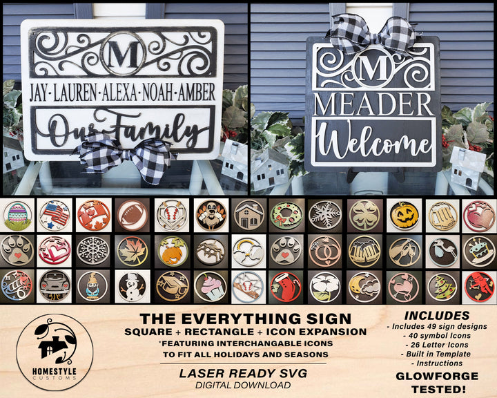 The Everything Sign Bundle - 50 Designs, 40 Icon Symbols, 26 Icon Letters - Interchangeable - Built in Template - SVG Download - Sized for Glowforge