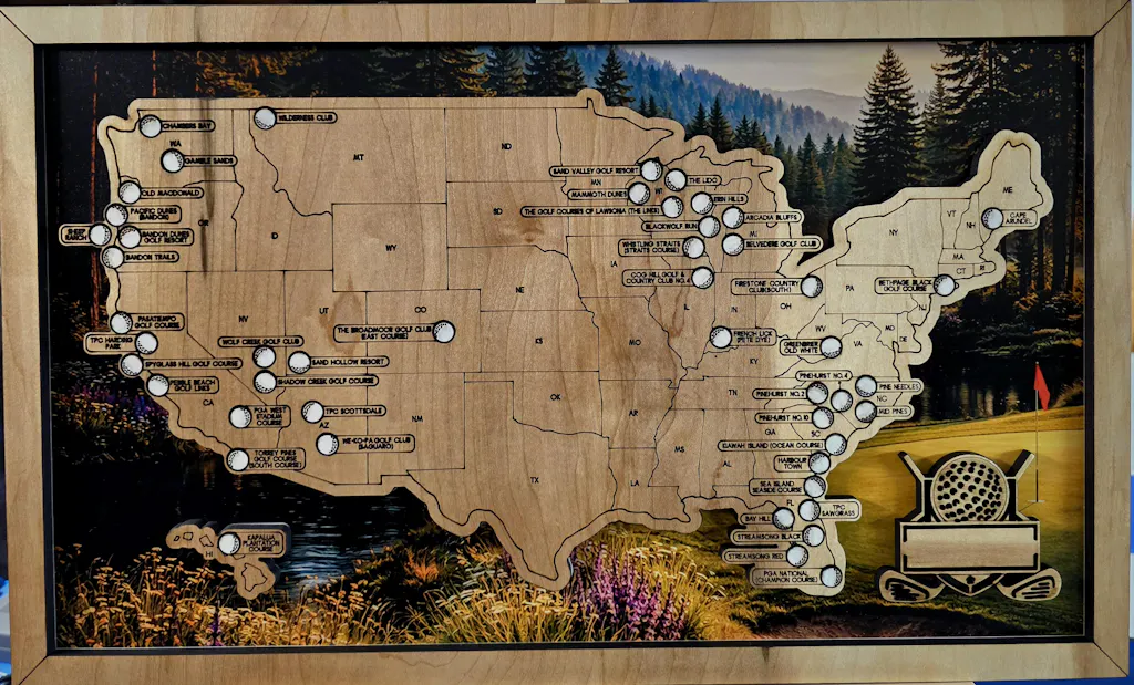 The Golf Travel Map is a laser-ready digital design created to help golfers track and showcase the courses they’ve played—and the ones still on their bucket list. This file includes two detailed top layers featuring the Top 50 U.S. Golf Courses and the Top 50 Public Golf Courses, giving you a premium, layered look that stands out. The background includes cut, scored, and engraved options, along with UV printing variations, offering flexibility across different materials and production styles. Three customizable nameplates are included, allowing you to add a golfer’s name, team name, or custom message—making it perfect for personal keepsakes, tournament awards, clubhouse décor, gifts, or products made for sale.