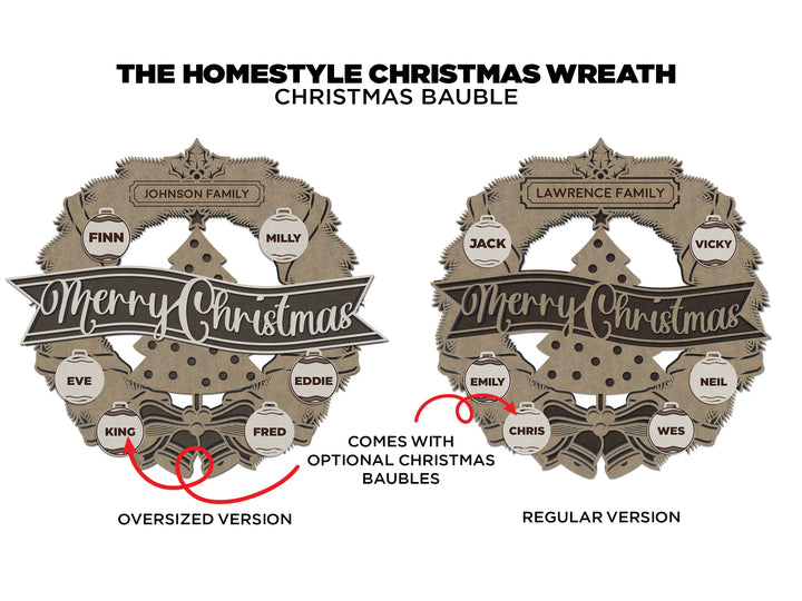 The Homestyle Christmas Wreath features a customizable design where you will be able to add names of your family members to baubles that are then secured to the wreath. Our wreath is available in a 10.5”x10.5” regular version and a 18”x18” oversized version that is perfect for your door during the Christmas months.