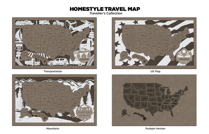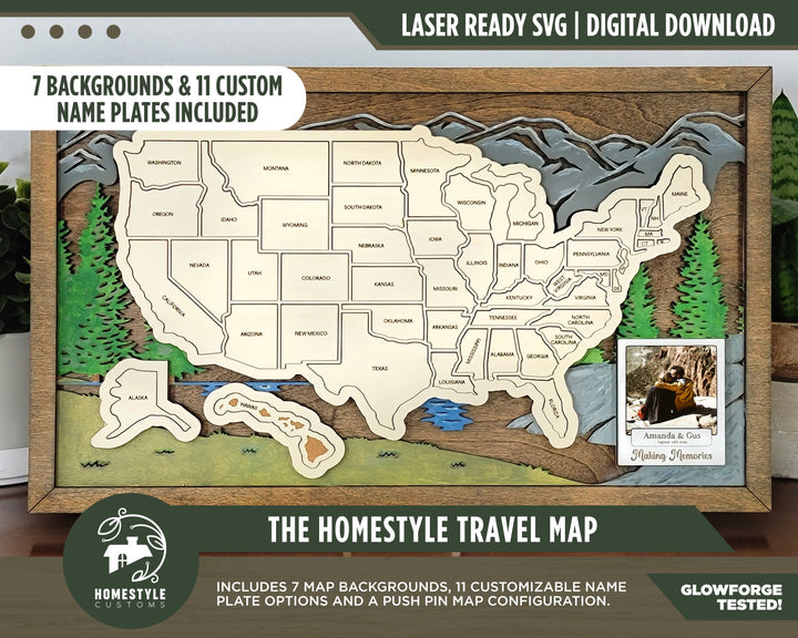 The Homestyle Travel Map - 7 Backgrounds & 11 Customizable Name Plates - SVG File Download - Sized for Glowforge