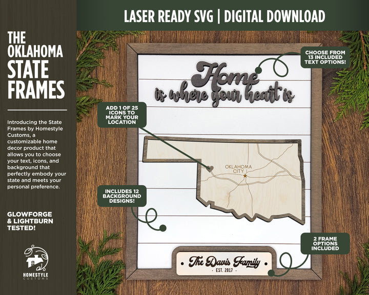 The Oklahoma State Frame - 13 text options, 12 backgrounds, 25 icons Included - Make over 7,500 designs - Glowforge & Lightburn Tested