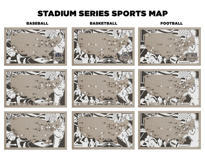 Introducing the Stadium Series Travel Maps. What better way to track and display the stadiums that you have visited along with the ones you plan traveling to in the future. There are two options available with one being a customizable version where you can add your own name and message and another general version without any customization. Both options will make a perfect keepsake or gift for that special someone.